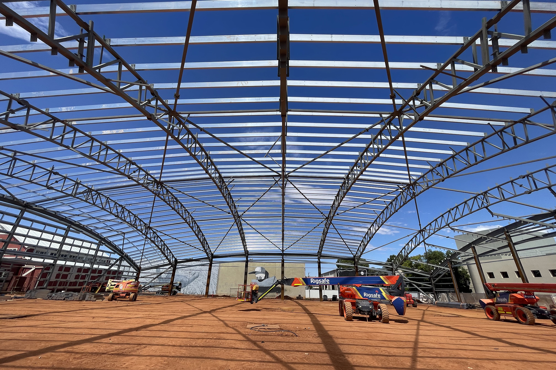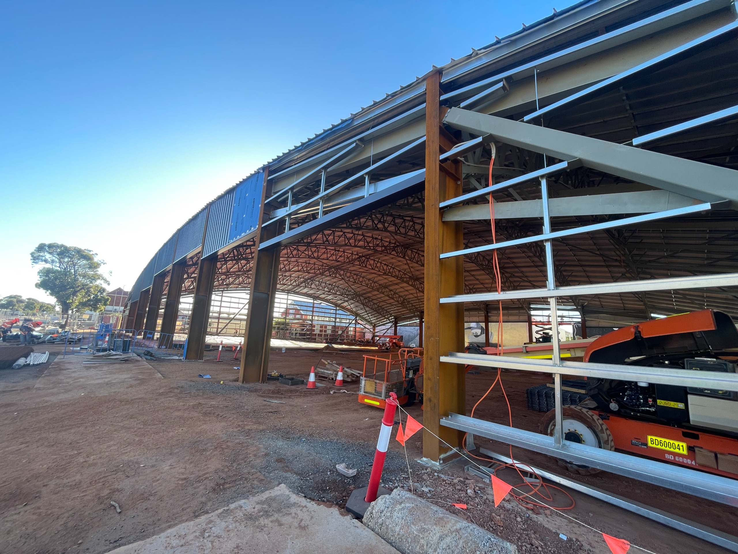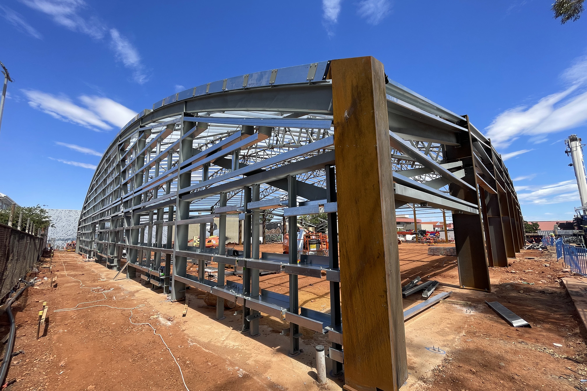 - Erection of the pavilion’s 50m x 60m steel frame structure with curved roof design.