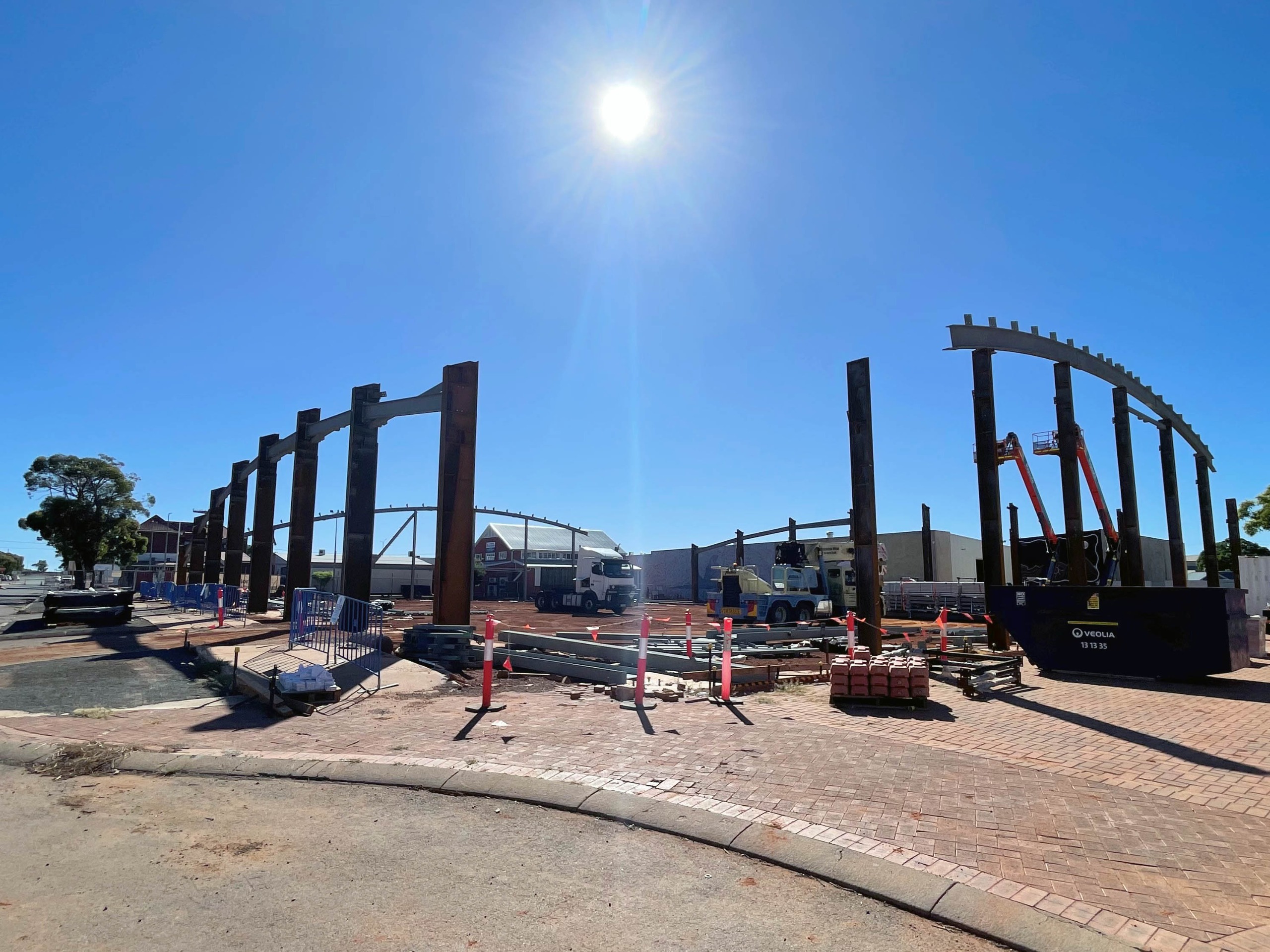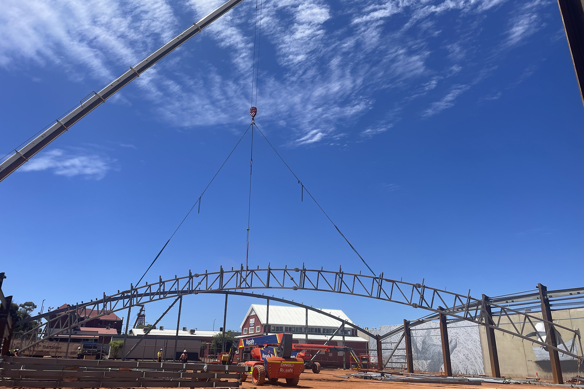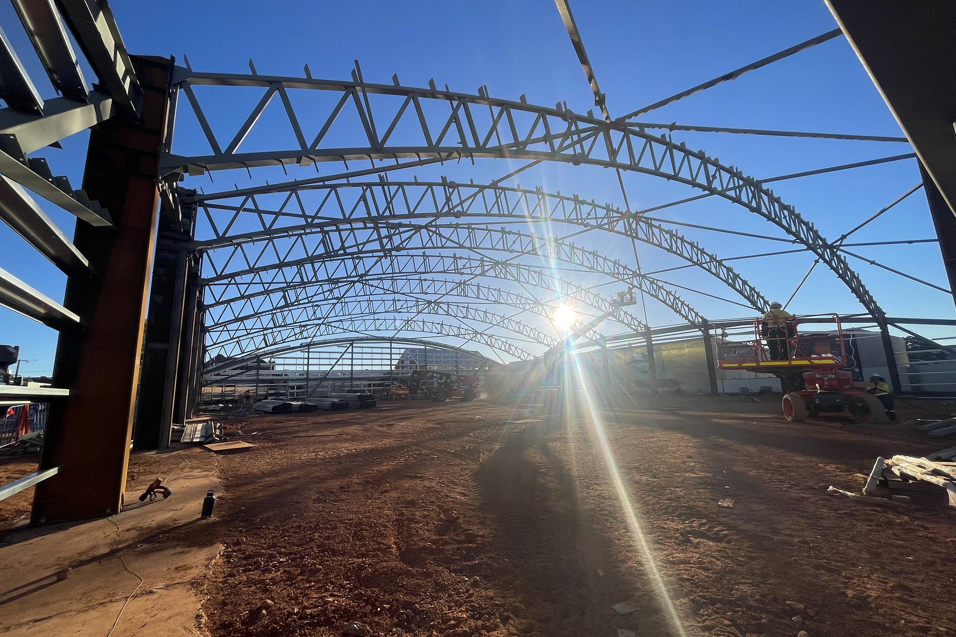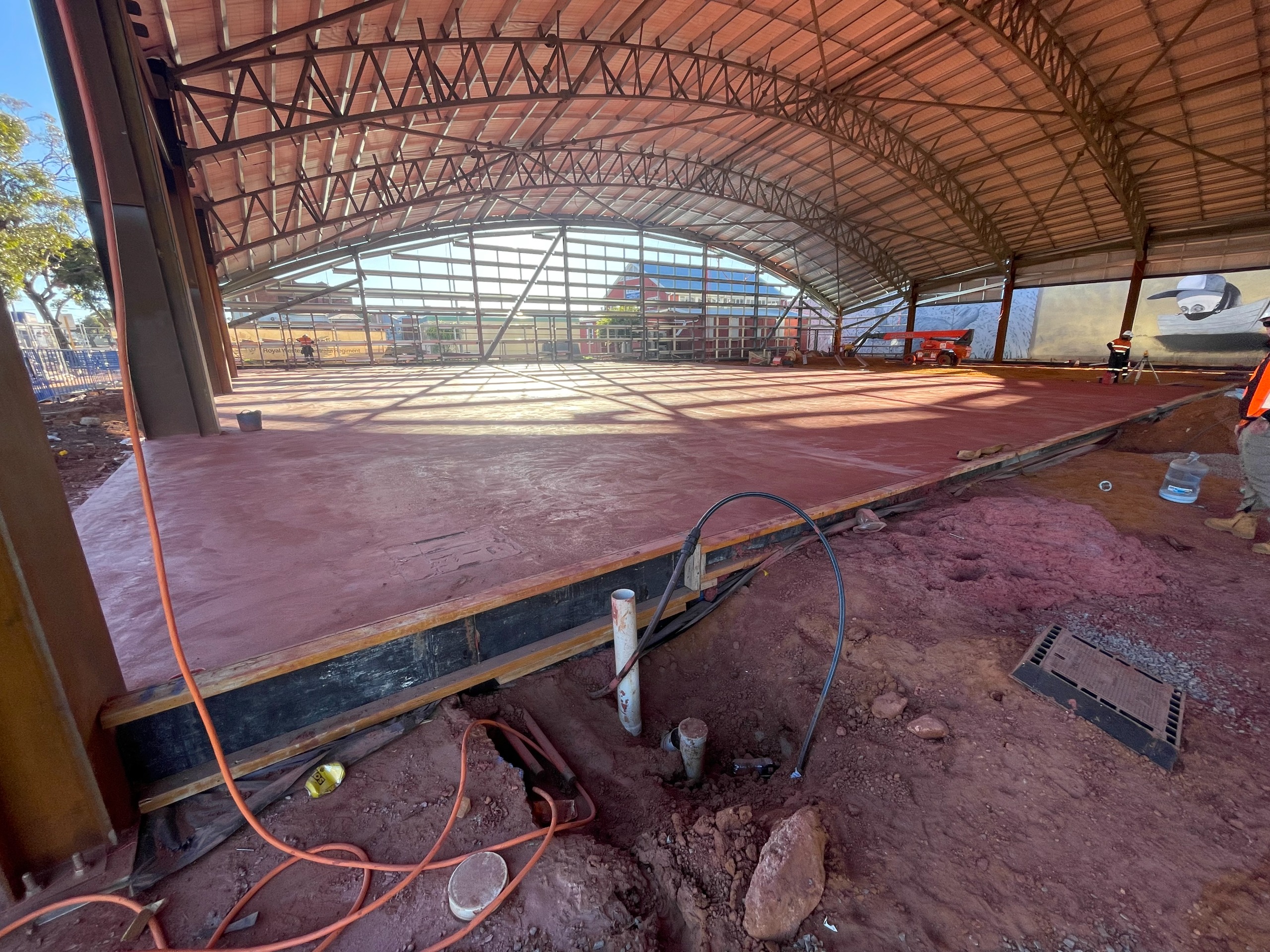 - Erection of the pavilion’s 50m x 60m steel frame structure with curved roof design.